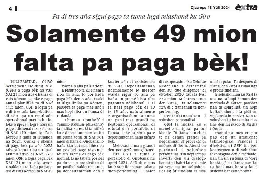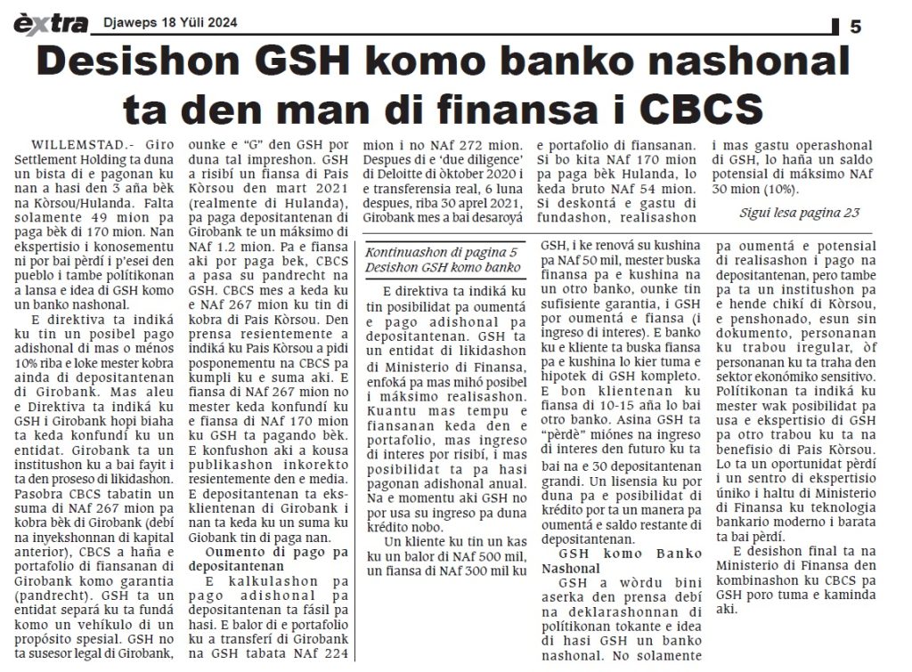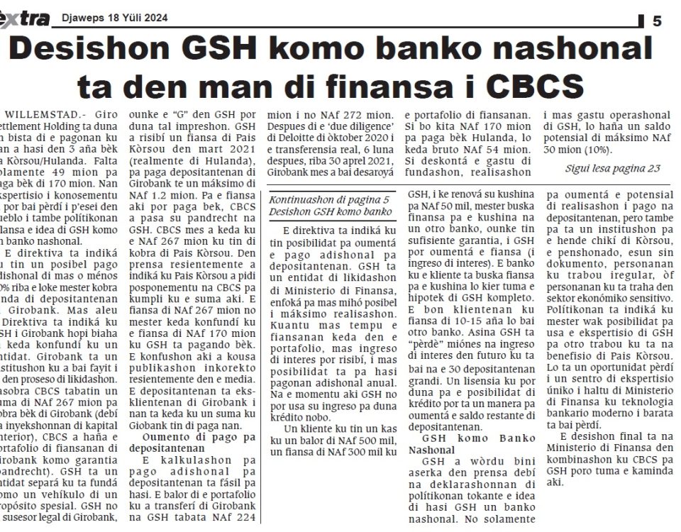 July 29, 2024Artikulo Extra fecha 18 Yüli 2024 “Desishon GSH komo banko nashonal ta den man di finansa i CBCS”