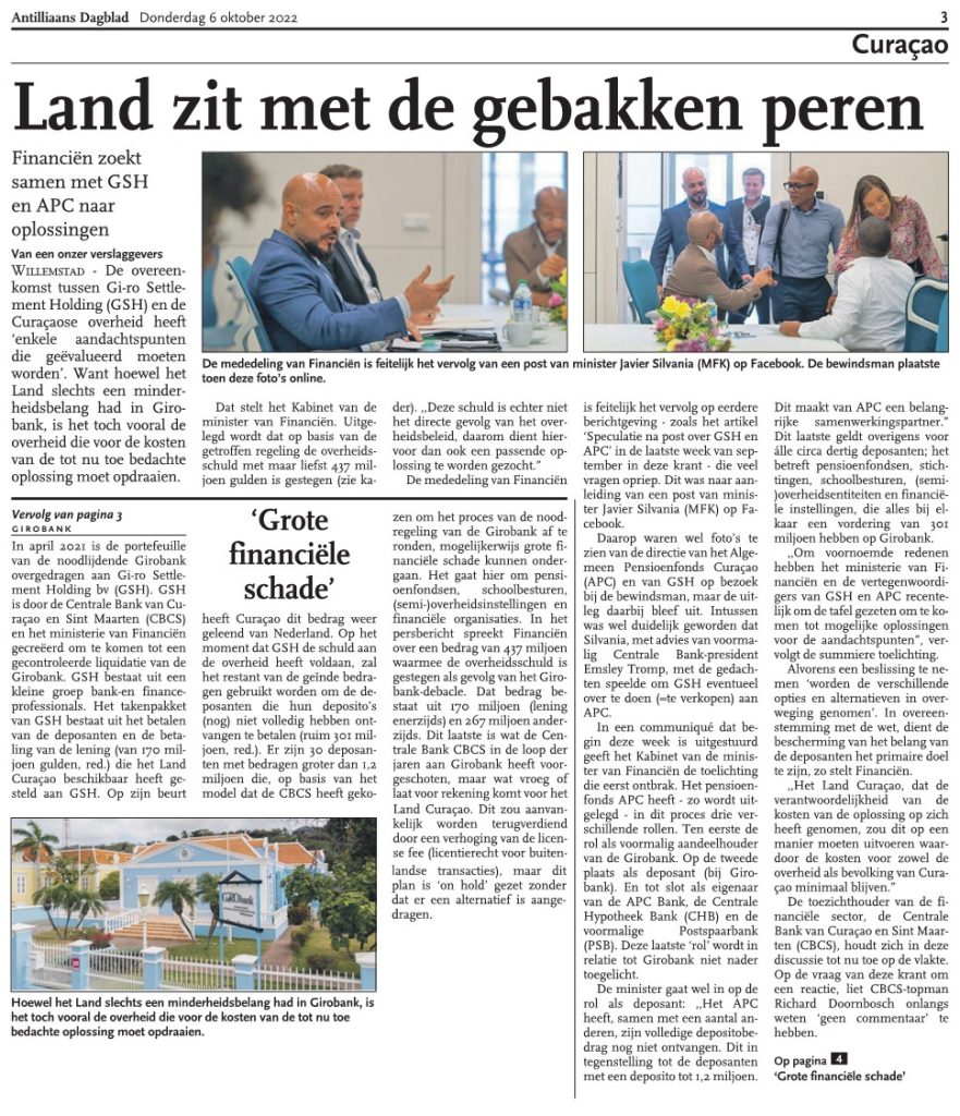 Artikel Extra d.d. 5 Oktober 2022 “Ministerio Di Finansa, GSH I APC Ta Evaluá”