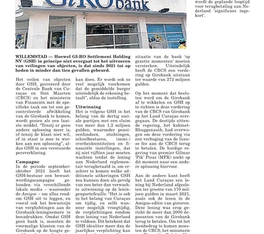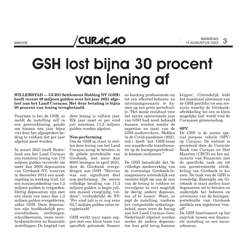 Artikel Amigoe d.d. 15 Augustus 2022 “GSH Lost Bijna 30 Procent Van Lening Af”